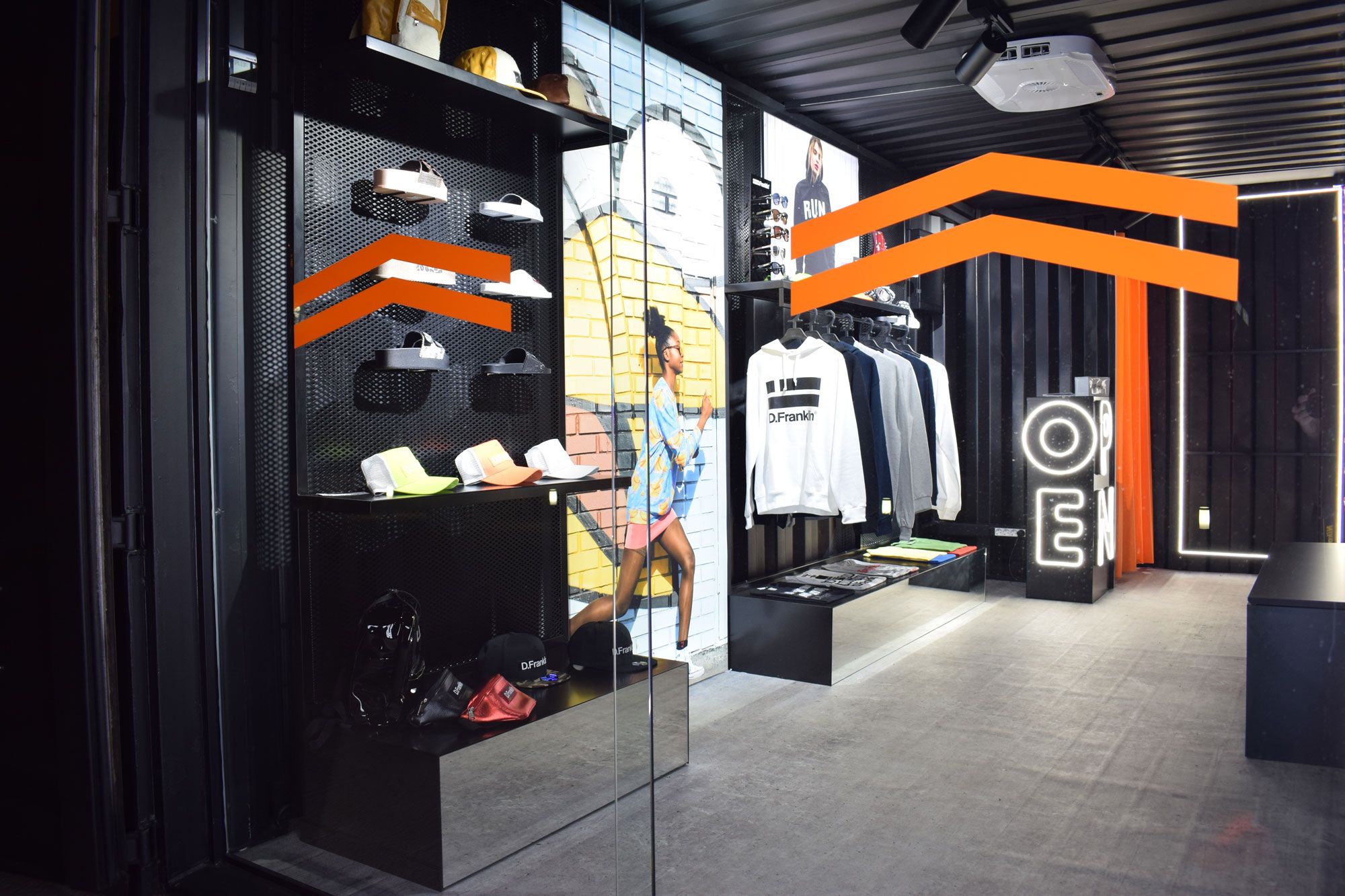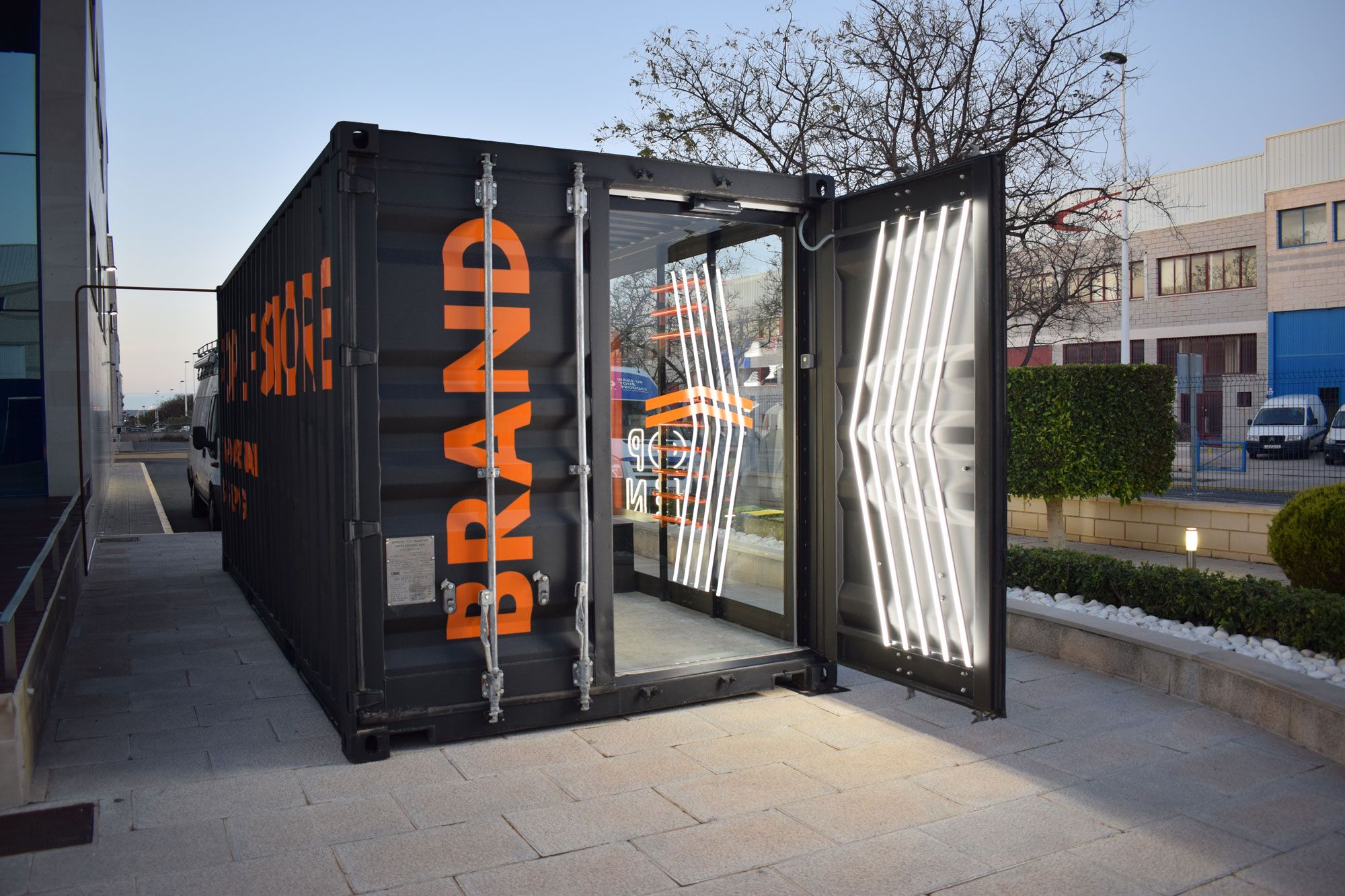 Desde The Pop Up Concept revolucionamos el concepto de tienda sin dejar atrás ningún elemento de los comercios retail tradicionales. Su interior cuenta con expositores de complementos y de productos textiles, banco de descanso, mostrador con corpóreas Neón Flex y un vestidor con espejo iluminado.
